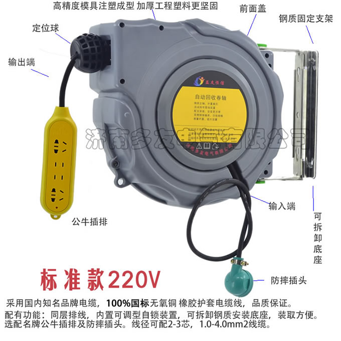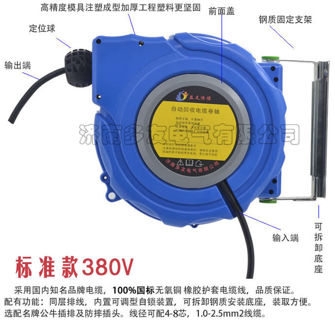 本產(chǎn)品自動電纜卷盤采用質(zhì)量上乘的abs工程塑料和高品質(zhì)的零部件制成,超精細精工磨具鑄造而成,內(nèi)有自動排線結(jié)構(gòu)和自動鎖定裝置,可實現(xiàn)自由拉伸、自動回縮線纜、自動線長定位,控制電纜拉出和回收的長度。自由伸縮設(shè)計實現(xiàn)占用空間少的目的,使用方便快捷,使場地更整潔有序,采用高品質(zhì)橡膠護套電纜,延長設(shè)備使用壽命。本產(chǎn)品可靈活的固定在墻壁或天花板上,不受工作空間的限制,拉伸長度在規(guī)定的范圍內(nèi)自由調(diào)節(jié)。固定后盤體可左右180度擺動,工作范圍大,適用于:汽修汽保/汽車美容,生產(chǎn)流水線,電子廠,電廠,特種車輛制造裝備車間、機電維修,各汽車4s品牌店等多場所的使用。