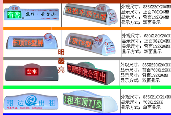 出租車led頂燈屏產(chǎn)品安 裝在出租車(頂端)車頂上、高亮顯示、車頂恒流板。使用該產(chǎn)品你盡可發(fā)揮你的想象力:求助信息、提示信息、推銷自己或推銷你的公司。讓行駛的出租車在人群中為你做免費宣傳(只需有一件我公司產(chǎn)品),它的效果令你意想不到,可比擬你家電視機(jī)。這是一條嶄新的生財之道。