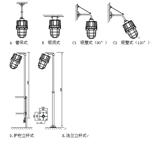 8. 本燈具適用于管吊式、吸頂式、吸壁式、立桿式多樣安 裝方式,(見安 裝示意圖)。