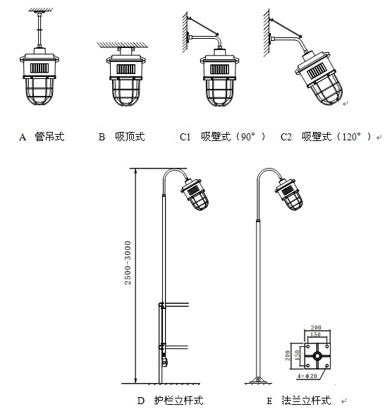 9. 適用管吊式、吸頂式、吸壁式、立桿式多種安 裝方式(見(jiàn)安 裝示意圖)。