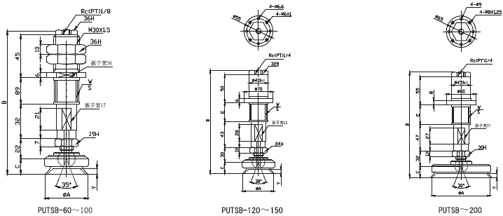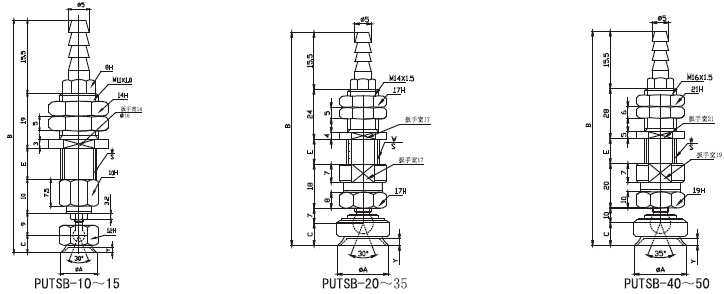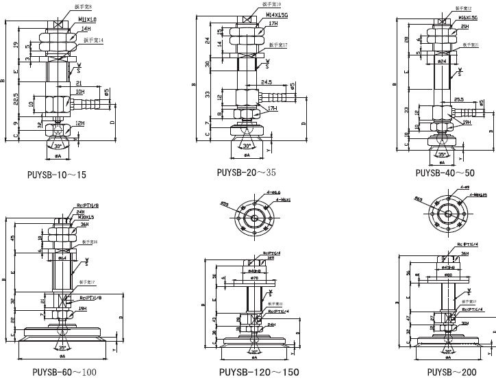 putsb/puysb帶金屬支架附緩沖搖擺吸盤外形尺寸圖:
