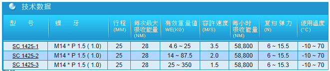說 明:牙規(guī) m 14 * pitch 1.5 (1.0),緩沖行程 25 mm。產品以pe袋封口包裝,再裝入內盒,附兩個螺帽;定位螺帽為選購配件。