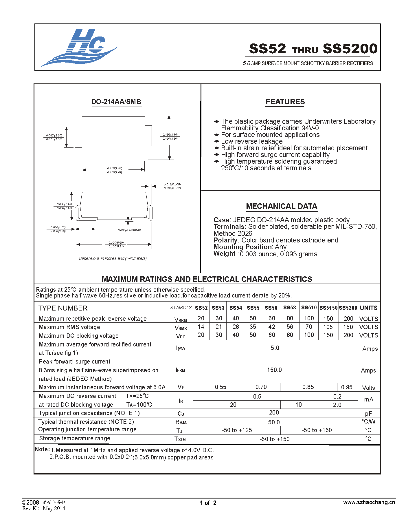 ss54貼片二極管產(chǎn)品規(guī)格書: