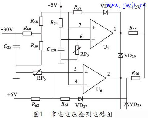 從此圖可以看出,當市電輸入電壓為220v時,經(jīng)變壓整流得到一個約為+30v的市電輸入檢測信號電壓,該電壓高低與市電輸入電壓成正比。此電壓經(jīng)r60、r59、c25濾波后,得到一個+2.4v的直流電平信號,該信號分別送到u5的7腳和u6的4腳。由-5v經(jīng)r54、rp5分壓得到的1.6v接至u5的6腳。此時u5的1腳、u6的2腳都輸出+12v的高電位,使后續(xù)電路中的繼電器不工作,市電的輸入與輸出保持連通狀態(tài)。當市電電壓低至170v以下時,u5的第7腳電位降至1.5v以下,低于第6腳的電位,第1腳輸出低電位,使后續(xù)電路中繼電器動作,切斷市電通路,ups轉(zhuǎn)為逆變輸出;當電壓高于260v時,u6的第2腳輸出低電位,后續(xù)電路中的繼電器動作,切斷市電通路,ups轉(zhuǎn)為逆變輸出。
