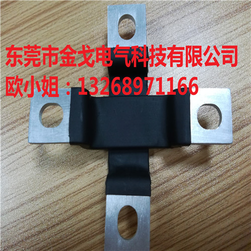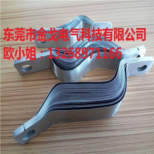 鋁箔軟連接采用優(yōu)質(zhì)0.05~0.3mm厚鋁箔,常規(guī)使用0.1厚鋁箔,上下表面貼0.1厚純鎳片,或0.1厚鍍鎳銅片,將疊片部分壓在一起,兩端或者打孔部分采用高分子擴散焊,通過大電流加熱壓焊成型。中間套熱縮管保護(hù),大尺寸異形產(chǎn)品,中間采用浸塑工藝。