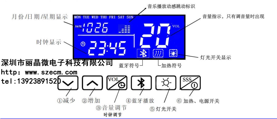 時鐘調(diào)節(jié):長按③鍵3秒則關(guān)閉藍(lán)牙播放功能可以調(diào)整日期和時間,此時時鐘顯示小時的數(shù)字閃爍,在閃爍時可通過按下①鍵或②鍵調(diào)整小時值;調(diào)整完畢后再按③鍵,時鐘顯示分鐘的數(shù)字閃爍,在閃爍時可通過按下①鍵或②鍵調(diào)整分鐘值;再按下③鍵,顯示月份數(shù)字閃爍,在閃爍時通過按下①鍵或②鍵調(diào)整月份,以此類推,后于年份設(shè)置完畢后待數(shù)字不再閃爍即完成時鐘設(shè)置;(時鐘設(shè)置只能在藍(lán)牙功能關(guān)閉的情況下才能操作)