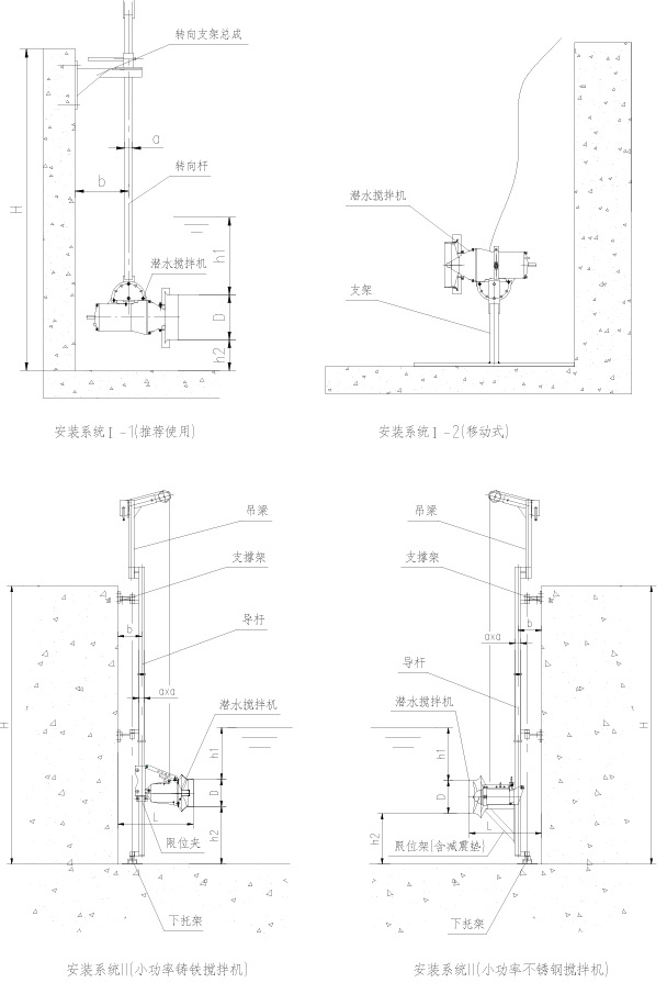 潛水?dāng)嚢铏C(jī)必需完全潛入水中工作;不能在易燃易爆或有強(qiáng)腐蝕性液體的環(huán)境中工作;鋼膨脹螺栓須按要求固定,安裝完畢后,必須將電纜拉緊固定好.
