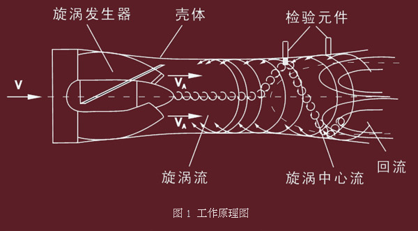 旋進旋渦流量計的流通剖面類似文丘利管的型線(如下圖)。在入口側(cè)安放一組螺旋型導(dǎo)流葉片,當流體進入流量傳感器時,導(dǎo)流葉片迫使流體產(chǎn)生劇烈的旋渦流。當流體進入擴散段時,旋渦流受到回流的作用,開始作二次旋轉(zhuǎn),形成陀螺式的渦流進動現(xiàn)象。該進動頻率與流量大小成正比,不受流體物理性質(zhì)和密度的影響,檢測元件測得流體二次旋轉(zhuǎn)進動頻率就能在較寬的流量范圍內(nèi)獲得良好的線性度。信號經(jīng)前置放大器放大、濾波、整形轉(zhuǎn)換為與流速成正比的脈沖信號,然后再與溫度、壓力等檢測信號一起被送往微處理器進行積算處理,最后在旋進旋渦流量計液晶顯示屏上顯示出測量結(jié)果(瞬時流量、累積流量及溫度、壓力數(shù)據(jù))。
