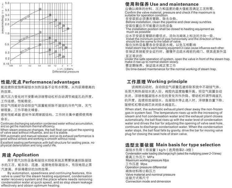 浮球式疏水閥利用雙閥孔,使閥蕊在開閥時壓力相對減少,從而獲得大排量。工作時浮球隨閥腔內(nèi)液體位的變化而上下浮動,帶動杠桿打開或關(guān)閉閥座。由于閥座孔在凝結(jié)水水位以下,形成水封,水、汽自然分離,達到無蒸汽泄漏。背壓率為80%,小工作壓力0.01mpa,從0.01mpa至使用壓力范圍之內(nèi)不受溫度和工作壓力波動的影響,連續(xù)排水。能排飽和溫度凝結(jié)水,小過冷度為0℃,加熱設(shè)備里不存水,能使加熱設(shè)備達到換熱效率。