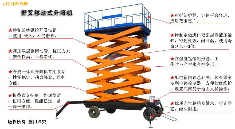 產(chǎn)品說(shuō)明:移動(dòng)剪叉式升降機(jī)的剪叉結(jié)構(gòu)主要采用鋼鐵矩形管制作,它的剪叉機(jī)械結(jié)構(gòu),使升降臺(tái)起升有較高的穩(wěn)定性,寬大的作業(yè)平臺(tái)和較高的承載能力,使高空作業(yè)范圍更大、并適合多人同時(shí)作業(yè)。平臺(tái)升降動(dòng)力為手動(dòng)或電動(dòng),電手兩用或遙控器控制,在停電時(shí)仍可使用。本產(chǎn)品具有移動(dòng)靈活、升降平穩(wěn)、操作方便、載重量大等特點(diǎn)。升降動(dòng)力分為220v或380v電源(也可以用電瓶、柴油機(jī)為升降動(dòng)力),采用意大利和國(guó)產(chǎn)液壓泵站,臺(tái)面設(shè)有防滑絕緣塑質(zhì)扣板,更換方便,整體美觀大方。