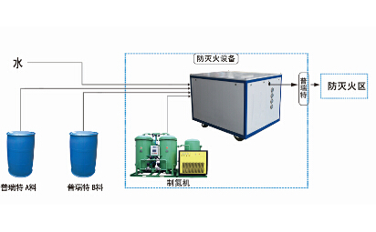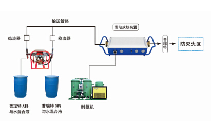 該系統(tǒng)由供水系統(tǒng)、普瑞特原料添加單元、發(fā)泡成膠單元三部分組成。將普瑞特a料和b料定量加入水中,引入氮氣,通過管道將其向防滅火區(qū)灌注。