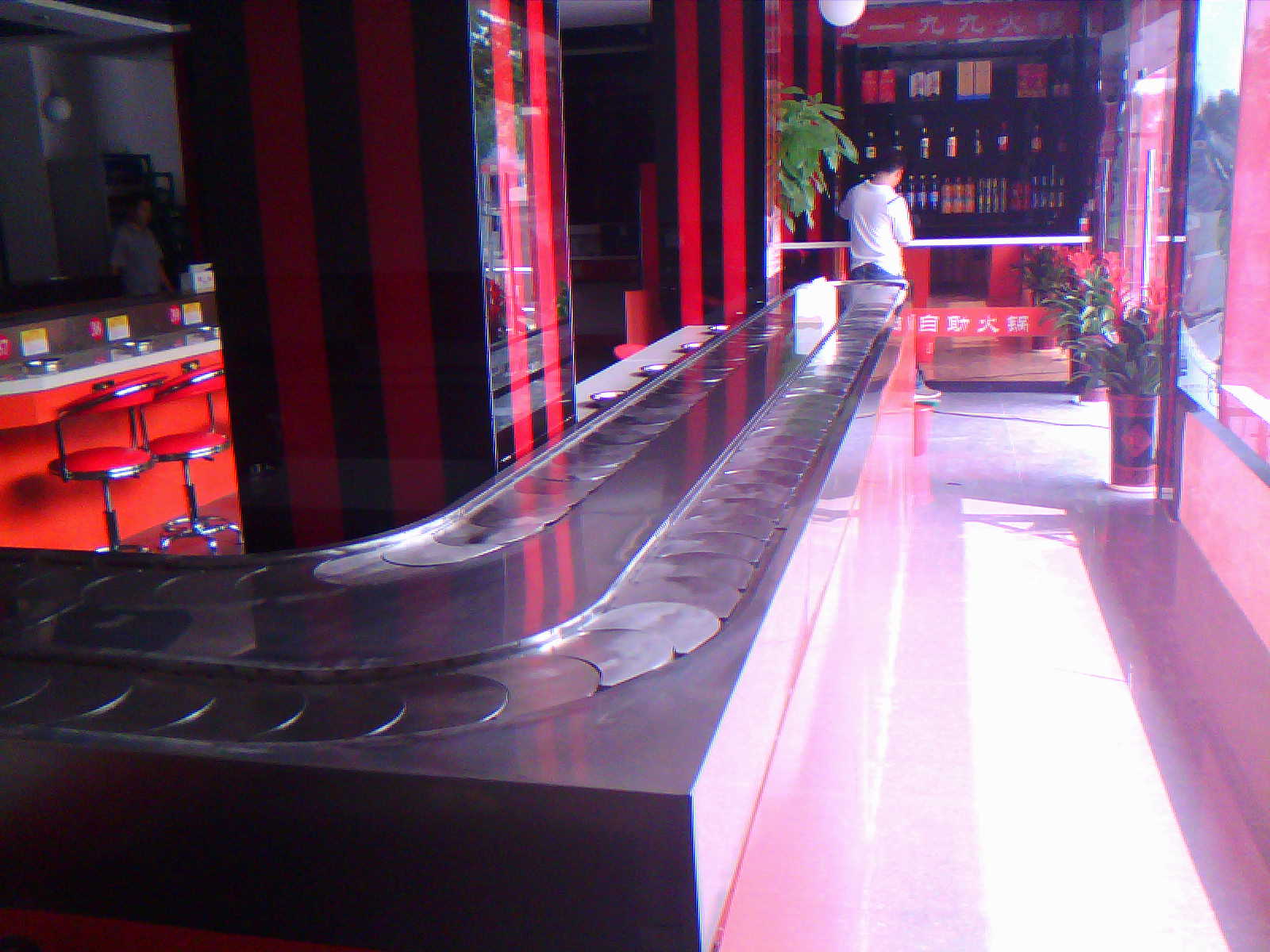 壽司設(shè)備 壽司輸送帶 自助旋轉(zhuǎn)火鍋線 自助火鍋 自助火鍋設(shè)備 旋轉(zhuǎn)自助火鍋是機(jī)械設(shè)備有限公司生產(chǎn)的酒店配套設(shè)備。生產(chǎn)的主要產(chǎn)品有:回轉(zhuǎn)壽司、壽司輸送帶、回轉(zhuǎn)壽司線、回轉(zhuǎn)壽司輸送帶、回轉(zhuǎn)火鍋傳送帶、壽司設(shè)備、回轉(zhuǎn)壽司設(shè)備、壽司線、壽司輸送線、壽司回轉(zhuǎn)輸送帶、壽司輸送設(shè)備、旋轉(zhuǎn)壽司設(shè)備、旋轉(zhuǎn)壽司輸送帶、壽司臺(tái)、旋轉(zhuǎn)壽司、壽司機(jī)械、回轉(zhuǎn)火鍋、回轉(zhuǎn)火鍋設(shè)備、回轉(zhuǎn)火鍋輸送帶、旋轉(zhuǎn)火鍋、回轉(zhuǎn)火鍋傳送帶等。壽司設(shè)備,壽司輸送帶,自助旋轉(zhuǎn)火鍋線是餐飲創(chuàng)業(yè)首選設(shè)備。不需要設(shè)大廚房,整個(gè)配制、加工過程,都由顧客在餐桌上自己完成,節(jié)省空間是其一優(yōu)點(diǎn); 不需要大型灶臺(tái)和灶具,無(wú)需大廚,普通服務(wù)員無(wú)需培訓(xùn)就能操作,簡(jiǎn)單易操作是其優(yōu)點(diǎn)之二; 回轉(zhuǎn)火鍋是一人一鍋,即可根據(jù)顧客喜愛選擇各色菜品又符合個(gè)人衛(wèi)生習(xí)慣,綠色飲食回歸自然是其優(yōu)點(diǎn)之三;獨(dú)特新穎的回轉(zhuǎn)火鍋設(shè)備工藝,配用現(xiàn)代高科技電磁爐具,沒有明火,不存在安 全隱患,沒有絲毫油煙產(chǎn)生,環(huán)保、衛(wèi)生是其優(yōu)點(diǎn)之四。回轉(zhuǎn)火鍋設(shè)備均由以下部分構(gòu)成:臺(tái)架系統(tǒng)、動(dòng)力系統(tǒng)、輸送鏈系統(tǒng) 、軌道系統(tǒng)。 我司的回轉(zhuǎn)輸送設(shè)備采用進(jìn)口電器元件、鏈片及導(dǎo)軌均采用304不銹鋼材質(zhì),配合不銹鋼鏡面板或不銹鋼拉絲面板,外觀整潔、美觀。