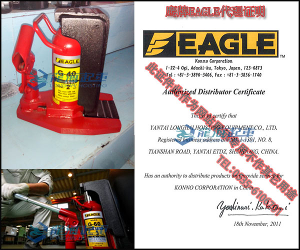鷹牌g系列爪式千斤頂(鷹牌爪式千斤頂、鷹牌標準型爪式千斤頂、鷹牌長趾型爪式千斤頂)屬于日本鷹牌eagle原裝產(chǎn)品--授權于煙臺開發(fā)龍海起重工具有限公司,并配有授權書、代理證明,假一罰百!【1年/現(xiàn)貨供應】【日本eagle鷹牌:重工業(yè)級別千斤頂】鷹牌g系列爪式千斤頂參數(shù):