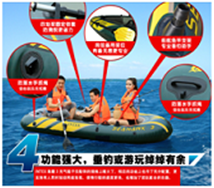 (4)隨船配有修補材料,如不慎刺破充氣船可自行修補。儲物袋,可放置隨身物品。船可配船外機,令休閑、垂釣更加輕松