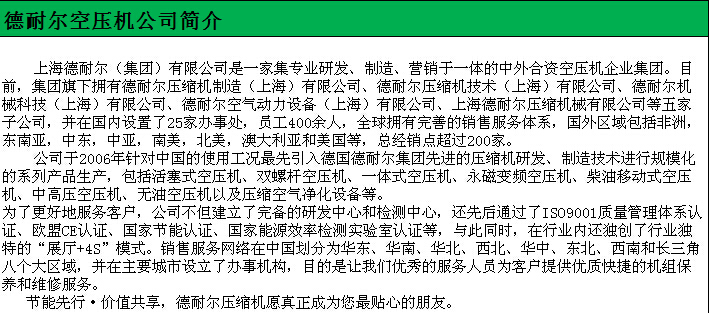 上海德耐爾(集團)有限公司是一家集專業(yè)研發(fā)、制造、營銷于一體的中外合資空壓機企業(yè)集團。目前,集團旗下?lián)碛械履蜖枆嚎s機制造(上海)有限公司、德耐爾壓縮機技術(shù)(上海)有限公司、德耐爾機械科技(上海)有限公司、德耐爾空氣動力設(shè)備(上海)有限公司、上海德耐爾壓縮機械有限公司等五家子公司,并在國內(nèi)設(shè)置了25家辦事處,員工400余人,全球擁有完善的銷售服務(wù)體系,國外區(qū)域包括非洲,東南亞,中東,中亞,南美,北美...