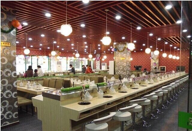鏈板及鏈條均采用304磨沙面沖壓而成,板厚1.8mm,寬度140mm,鏈條節(jié)距100mm,鏈條下部分導(dǎo)軌面板采用304銹鋼鏡面,板厚度為1.2mm,內(nèi)部采用白色防摩尼龍墊條,旋轉(zhuǎn)吧臺(tái),壽司料理,旋轉(zhuǎn)火鍋,自助火鍋餐廳。下架采30mm*30mm*1.5的碳鋼方管焊接而成,表面經(jīng)過防銹處理,所有連接部分均采用標(biāo)準(zhǔn)件連接,便于移裝。