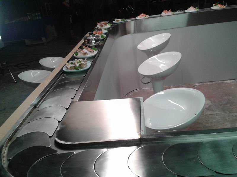 食客在各自的座位上可隨意選擇擺放在輸送帶上的食品,無(wú)需服務(wù)員送上,本機(jī)以臺(tái)架代替餐桌,可節(jié)省大量餐桌及臺(tái)布。3、餐點(diǎn)再旋轉(zhuǎn)中運(yùn)用明亮的燈光及輸送帶的移動(dòng)讓餐點(diǎn)變的更可口,