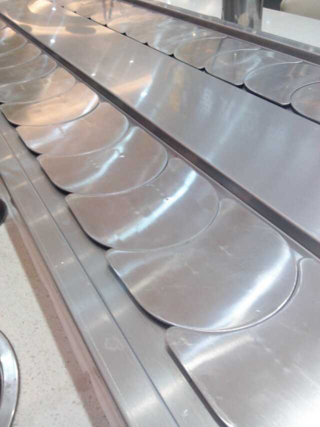 回轉(zhuǎn)火鍋設(shè)備鏈板及鏈條均采用304磨沙面沖壓而成,板厚1.8mm,寬度140mm,鏈條節(jié)距100mm,鏈條下部分導(dǎo)軌面板采用304銹鋼鏡面,板厚度為1.2mm,內(nèi)部采用白色防摩尼龍墊條,旋轉(zhuǎn)吧臺,壽司料理,旋轉(zhuǎn)火鍋,自助火鍋餐廳。下架采用30mm*30mm*1.5的碳鋼方管焊接而成,表面經(jīng)過防銹處理,所有連接部分均采用標(biāo)準(zhǔn)件連接,便于移裝。旋轉(zhuǎn)吧臺,壽司輸送設(shè)備,回轉(zhuǎn)火鍋輸送帶,適應(yīng)了飲食界推陳出新,適應(yīng)了現(xiàn)代人對飲食新奇的追求。旋轉(zhuǎn)吧臺,壽司輸送設(shè)備,回轉(zhuǎn)火鍋輸送線是你從事餐飲火鍋行業(yè),日本料理,韓國料理必備前衛(wèi)機械設(shè)備.旋轉(zhuǎn)火鍋 火鍋設(shè)備 回轉(zhuǎn)火鍋設(shè)備是從事餐飲創(chuàng)業(yè)者的理想選擇;疱佋O(shè)備優(yōu)勢:無明火:采用現(xiàn)代高科技環(huán)保制作用具,沒有明火,不存在安 全隱患。