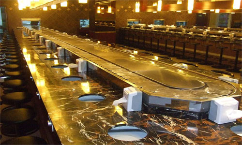 節(jié)省人力物力:客人在各自的座位上可隨意選擇擺放在輸送帶上的食品,無需服務(wù)員送上,本機以臺架代替餐桌,可節(jié)省大量餐桌及臺布。