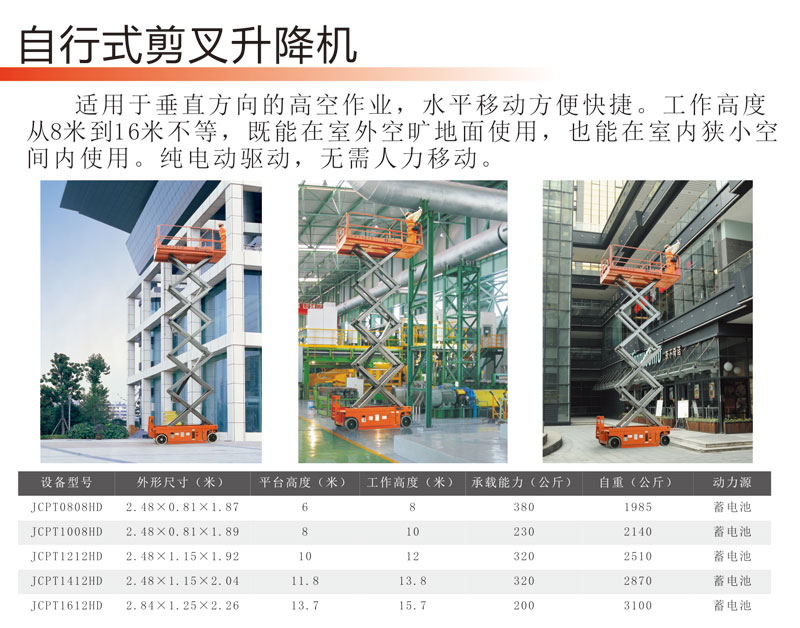 廣州杰程提供不同規(guī)格的自行走剪叉升降平臺,電動剪叉升降平臺出租,客戶可根據(jù)實際情況挑選適合的設(shè)備!設(shè)備基本技術(shù)參數(shù)請參考: