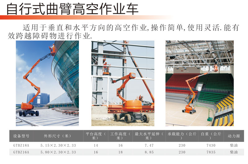廣州杰程提供安 全、高效的曲臂式高空作業(yè)平臺(tái),曲臂式高空作業(yè)車(chē)出租,設(shè)備規(guī)格如下: