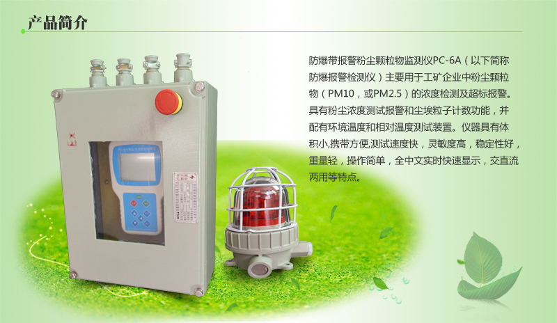防爆帶報警粉 塵顆粒物監(jiān)測儀pc-6a(以下簡稱防爆報警檢測儀)主要用于工礦企業(yè)中粉 塵顆粒物(pm10,或pm2.5)的濃度檢測及超標(biāo)報警。具有粉 塵濃度測試報警和塵埃粒子計數(shù)功能,并配有環(huán)境溫度和相對溫度測試裝置。儀器具有體積小,攜帶方便,測試速度快,靈敏度高,穩(wěn)定性好,重量輕,操作簡單,全中文實時快。