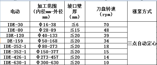 廣泛應(yīng)用于石油、化工、天然氣、食品、鋼爐、制藥、核電、場(chǎng)管建設(shè)等行業(yè)管道安 裝工程及搶修作業(yè)。脹緊機(jī)構(gòu)插于管子內(nèi)徑,可自動(dòng)定位對(duì)中,安 裝快速、容易。手動(dòng)進(jìn)刀機(jī)構(gòu)設(shè)計(jì),操作簡(jiǎn)便,切削量可微調(diào),坡口角度0°-37°任意選擇。管子直徑范圍:13-1500mm;管子壁厚:1.5-20mm;適用于各種等級(jí)的碳鋼、不銹鋼、合金鋼等材料管子的u、v型焊縫的坡口、倒棱、削邊等加工,還可以對(duì)焊后的凸面法蘭和平面法蘭進(jìn)行切削坡口加工。
