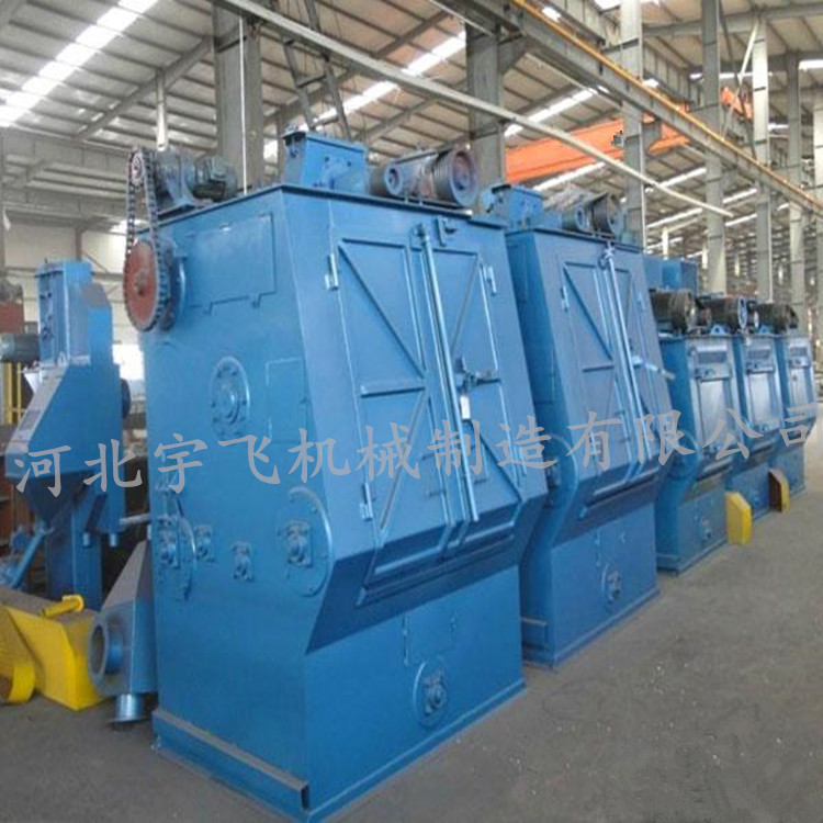 不同規(guī)格的產(chǎn)品被倒入清理室內(nèi),大門關(guān)閉,拋丸器工作,將彈丸(鑄鋼丸或鋼絲切丸)加速拋射至工件表面,對工件表面進(jìn)行沖擊,刮削以清除產(chǎn)品表面的鐵銹、氧化皮和污物;清理過程中產(chǎn)生的粉 塵由除塵器除去,拋丸結(jié)束后,啟動履帶反轉(zhuǎn),將工件自動倒進(jìn)產(chǎn)品小車中,從而使工件達(dá)到除銹、去氧化皮的目的。