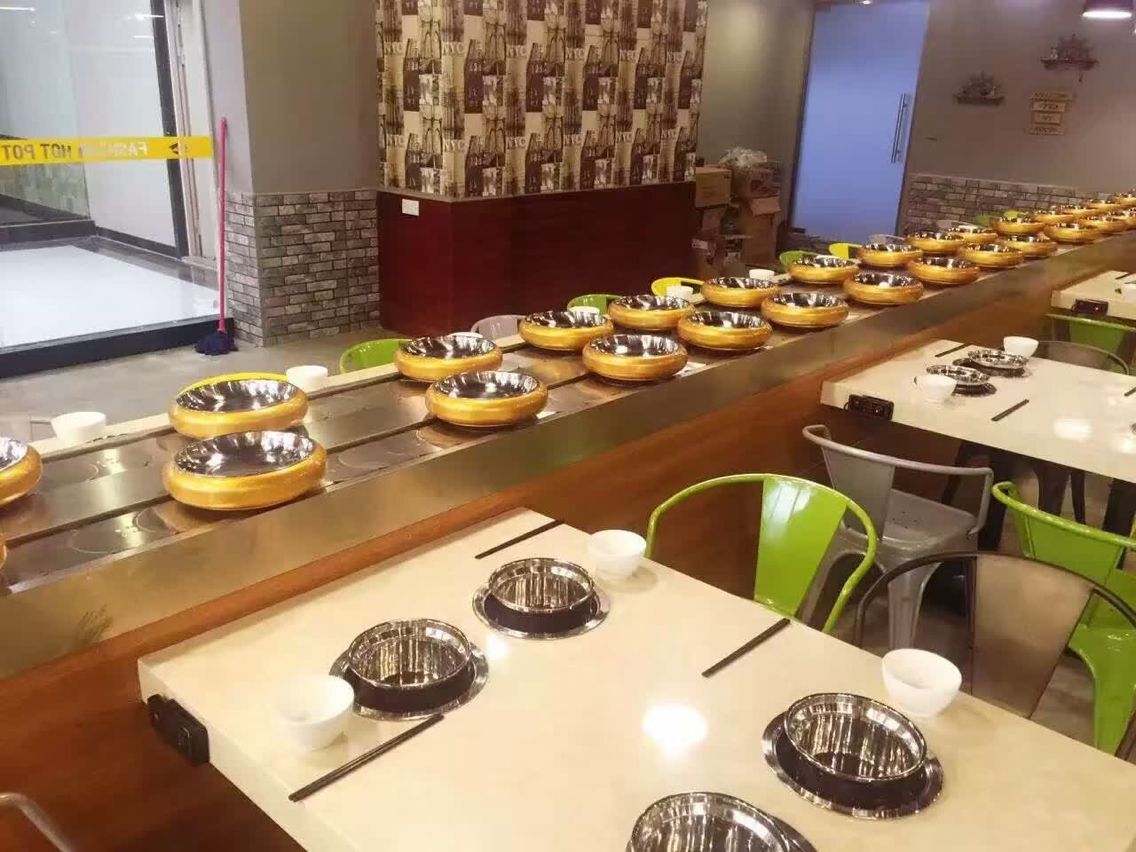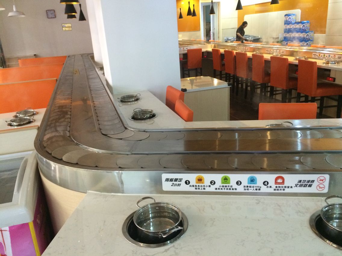 水滴到鏈板上也不怕,只需用抹布一擦,便一干二凈,方便衛(wèi)生,是火鍋店必備產(chǎn)品;剞D(zhuǎn)火鍋線的創(chuàng)新點(diǎn):機(jī)械代替人力,把人解放出來,可以做更多的服務(wù)。