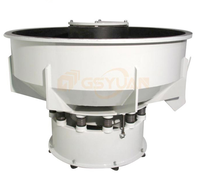 振動軸高速時,偏心塊產(chǎn)生離心力和傾倒力矩并通過彈簧的作用,使容器內(nèi)產(chǎn)生規(guī)律的翻滾運動,由于容器底部為一圓環(huán)型狀,而使容器中的磨料和工件既圍繞容器中心柱公轉(zhuǎn),以相互翻滾自轉(zhuǎn)。其合成運動為環(huán)狀螺旋運動。因為磨料和工件在運動時產(chǎn)生相對的作用力。所以磨料對工件能進行均勻的磨削。