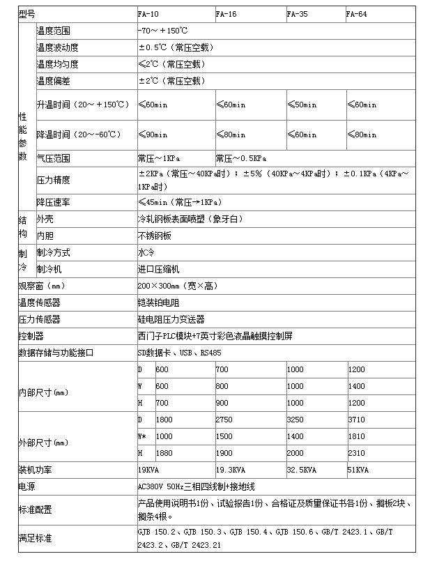 fa系列 高低溫低氣壓試驗箱適用于對材料類、電工電子類、軍工類等產品、零部件進行溫度、濕度、高度綜合試驗。