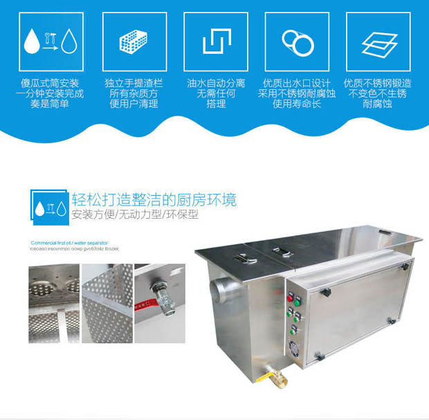 鐵山全自動(dòng)高效油水分離器隔油池隔油器是采用最新技術(shù)重力法、生化法和機(jī)械縫隙過濾相結(jié)合,將含油污水中的渣、油水自動(dòng)分離的新一代環(huán)保產(chǎn)品。在工藝原理和結(jié)構(gòu)設(shè)計(jì)上均有不少獨(dú)到之處,因而產(chǎn)品工作可靠,使用安 全,維護(hù)保養(yǎng)簡便,加之體積小,能耗低,使用壽命極長,不需添加任何試劑 和藥品,無二次污染。它根據(jù)水和油脂的不同介電常數(shù),采用了獨(dú)特的工藝原理和設(shè)備結(jié)構(gòu),使用rf技術(shù),自動(dòng)將廢水中的油脂分離出來,是目前國內(nèi)先進(jìn)理想的油水分離產(chǎn)品。