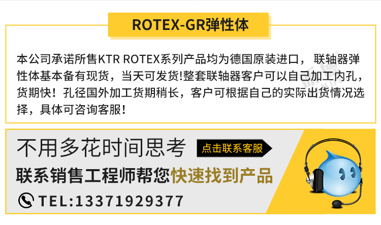 本公司承諾所售ktr rotex系列產(chǎn)品均為德國(guó)原裝進(jìn)口, 聯(lián)軸器彈性體基本備有現(xiàn)貨,當(dāng)天可發(fā)貨!整套聯(lián)軸器客戶可以自己加工內(nèi)孔,貨期快!孔徑國(guó)外加工貨期稍長(zhǎng),客戶可根據(jù)自己的實(shí)際出貨情況選擇,具體可咨詢客服!