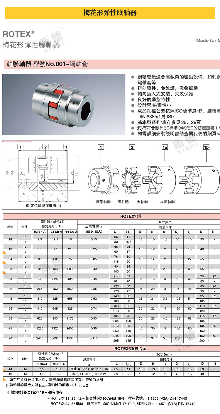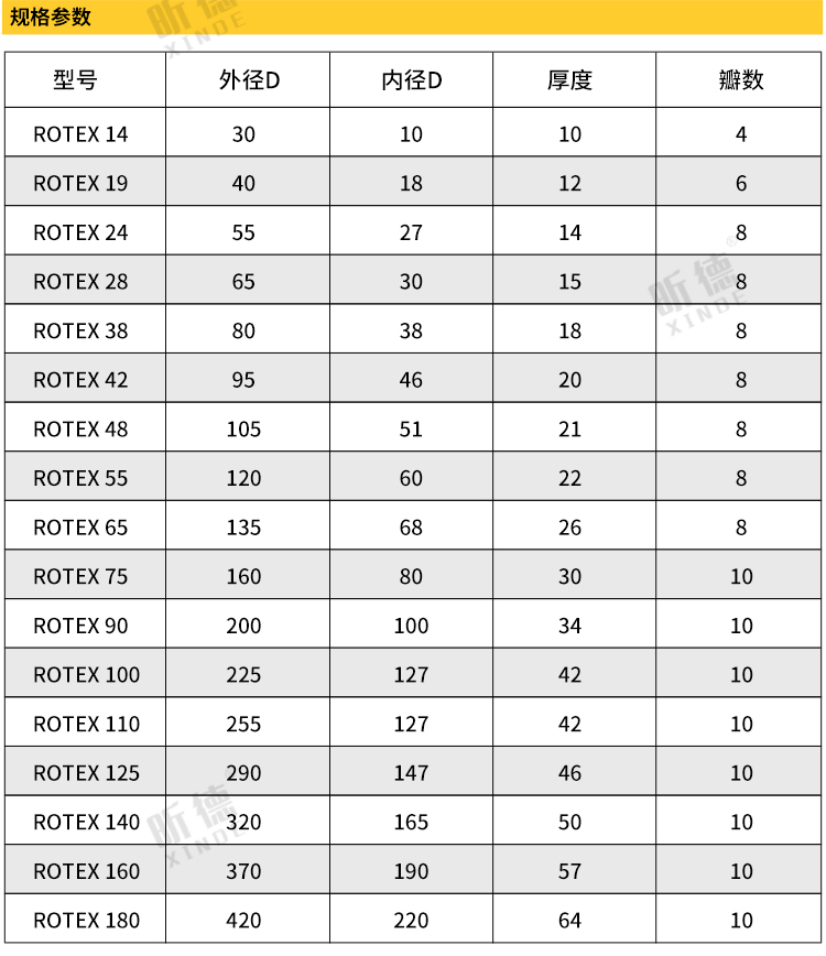 rotex彈性體的肖氏硬度通常為92 shore a。若需傳遞更高扭矩,可選用硬度為95/98 shorea和64 shore d-f的彈性體。