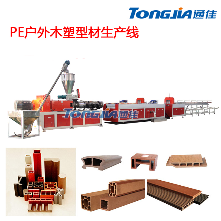 pe木塑戶外型材生產(chǎn)線【通過(guò)更換相應(yīng)模具,可用來(lái)生產(chǎn)戶外地板、戶外裝飾板、木塑護(hù)欄、桌椅、露天涼亭、架子、花箱等。pe木塑戶外景觀制品具有防水防潮、木質(zhì)感強(qiáng)、防腐防蟲蛀等特點(diǎn),還具有優(yōu)異的抗老化性能,在長(zhǎng)時(shí)間日曬雨淋的條件下,能做到不褪色、不變形。