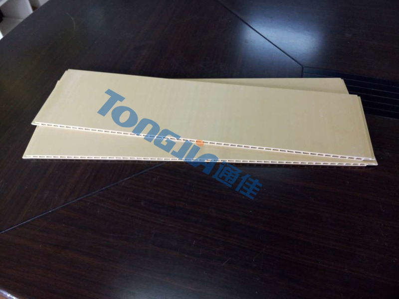集成吊頂裝飾板設(shè)備又稱"生態(tài)藝術(shù)墻"“快裝墻板”或者"集成墻面",是由pvc/竹木纖維為基材,表面可以燙印,貼膜的新型裝潢建材。墻板產(chǎn)品可完全取代傳統(tǒng)墻面裝飾材料。該產(chǎn)品表面可多樣化處理,表面處理主要有熱轉(zhuǎn)印,覆膜和印花等工藝。結(jié)構(gòu)上分為有縫連接和無縫連接。背板由平板和防滑槽兩種設(shè)計(jì)。在關(guān)鍵插接處設(shè)計(jì)有共擠涂層,以增加貼墻板安 裝時(shí)的握釘力!目前市場(chǎng)通用的木塑發(fā)泡貼墻板規(guī)格主要有300mm寬,600mm寬兩種。產(chǎn)品廣泛應(yīng)用于家庭,工程,寫字樓,酒店,餐廳,娛樂場(chǎng)所等。