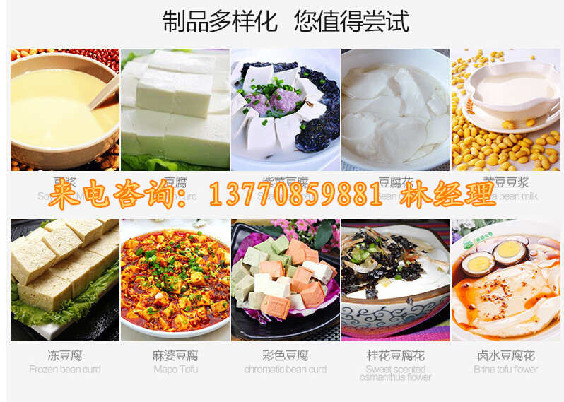 ★ 一機(jī)多用:可同時(shí)生產(chǎn)果蔬彩色豆腐系列產(chǎn)品單色(嫩,老)豆腐 多彩豆腐 單色豆腐皮 多色豆腐皮 彩色豆腐干 多彩色素 雞 豆?jié){ 豆腐花等豆制品制作,還可以與其他設(shè)備和工藝配套生產(chǎn)更多的豆制品