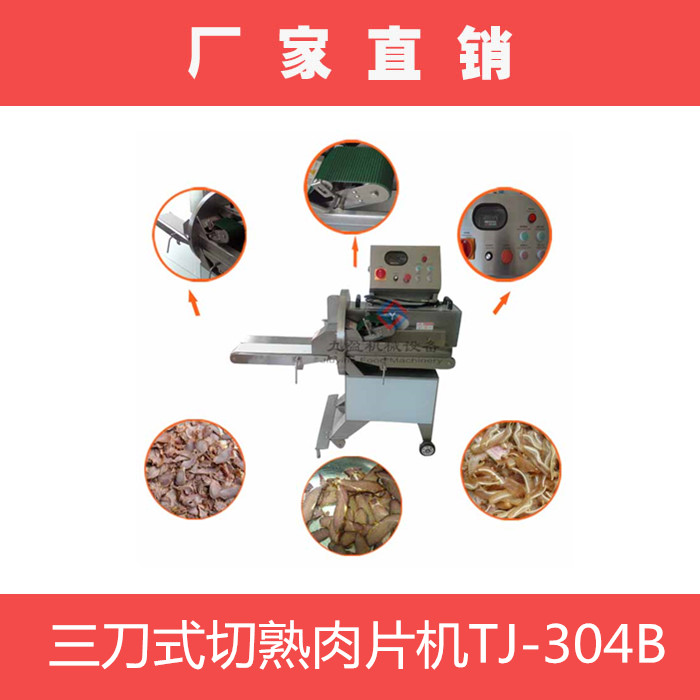 三刀式高效切熟肉機tj-304b,出料口帶輸送帶此機是本公司自行研發(fā)、設計的一款切熟肉機器,采用特制的三把刀片能將叉燒肉、鹵味、豬頭皮、豬耳朵、牛肚、肥腸、牛肉等熟肉切成條、片狀,出料口連接輸送帶,使得切出來的物料擺放整齊,無需排列可直接裝入托盤。適用快餐業(yè),超市,大型食堂,食品行業(yè)使用。