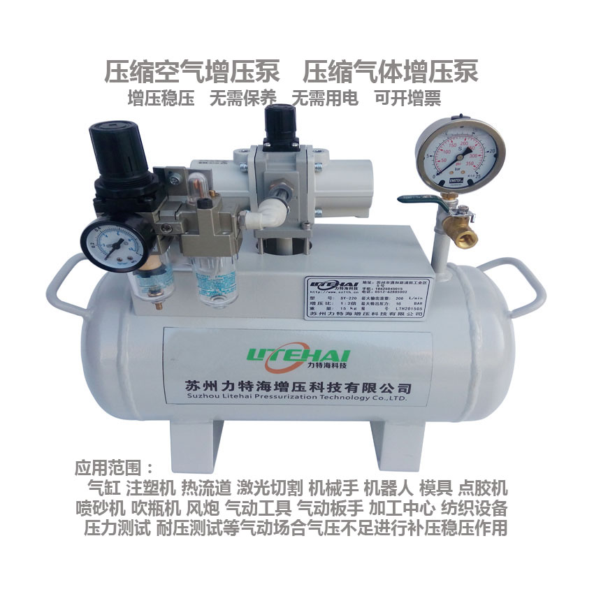 1.氣動(dòng)夾具,模具,熱流道,機(jī)械手臂,cnc氣動(dòng)夾刀頭,氣缸,吹瓶機(jī),激光切割機(jī),數(shù)控加工中心,電子廠,機(jī)械廠,毛紡廠,織布廠等各種氣動(dòng)設(shè)備壓力不足的增壓和穩(wěn)壓作用及各種破壞性壓力測(cè)試,氣體最大壓力可增壓到260mpa。