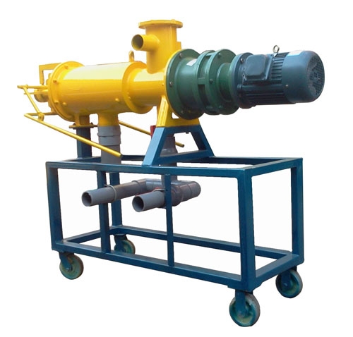 豬糞擠干機工作過程如下:無堵塞泵將未經發(fā)酵的豬糞水泵入機體,在振動電機的作用下加速落料,此時經動力傳動, 擠壓絞龍將糞水逐 漸推向機體前方,同時不斷提高前緣的壓力,