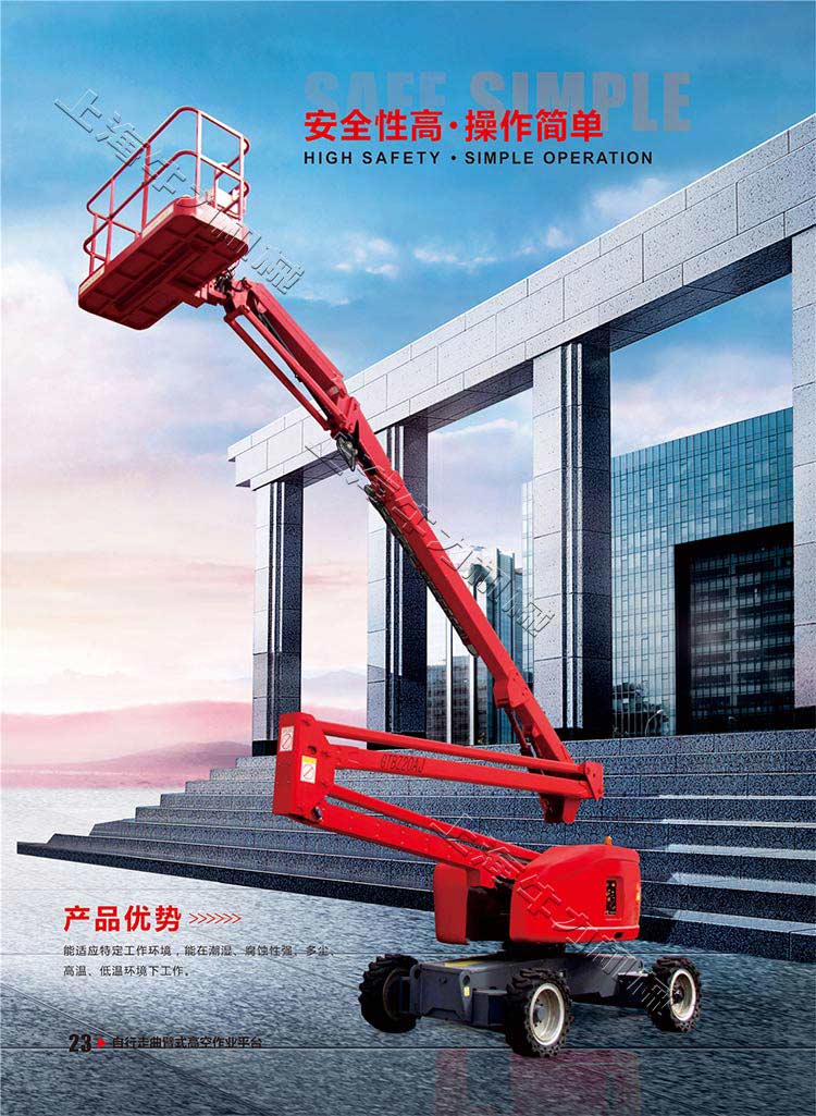 自行走曲臂式高空作業(yè)平臺具有伸縮臂,能懸伸作業(yè),跨越一定的障礙或者在一處升降可進行多點作業(yè);升降平臺移動性好,轉(zhuǎn)移場地方便;外型美觀,適合于室內(nèi)外作業(yè)。