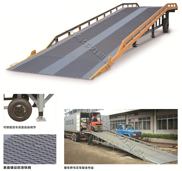 dcqy系列機械式移動登車橋 適用于裝卸作業(yè)不固定的場合,叉車可以直接通過它從地面駛入貨車上進行裝卸貨作業(yè)。
