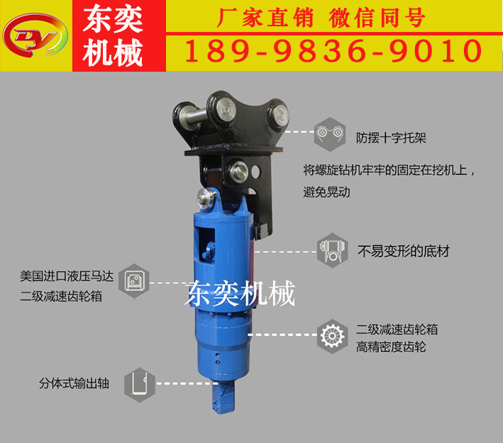 挖掘機(jī)螺旋鉆機(jī)安 裝拆卸方便。挖掘機(jī)小臂不用拆卸,直接類(lèi)似掛破碎錘一樣,管路系統(tǒng)都可以共用,真正實(shí)現(xiàn)一機(jī)三用——挖、破、鉆。拆卸時(shí)間和換斗時(shí)差不多。左右有擺動(dòng)角度36°。當(dāng)挖掘機(jī)在工地不平坦的情況下,挖機(jī)手可根據(jù)位置不同調(diào)整鉆桿角度,保持90°垂直下鉆,而挖改則不能調(diào)整,挖掘機(jī)是斜的就只能鉆斜孔。 作業(yè)半徑大。因?yàn)樾”鄄徊,它的作業(yè)半徑至少可以比挖改延長(zhǎng)作業(yè)半徑2-3米,且平打孔、仰角打孔、豎打孔都可以實(shí)現(xiàn)。我們螺旋鉆機(jī)可以根據(jù)不同配車(chē)進(jìn)行改裝,只要您提供對(duì)應(yīng)的配車(chē)我們給到您合適的方案可以進(jìn)行改裝,產(chǎn)品內(nèi)部給您做一個(gè)簡(jiǎn)單介紹,動(dòng)力機(jī)頭內(nèi)部采用引進(jìn)的是美國(guó)進(jìn)口的馬達(dá)提供足夠動(dòng)力,同時(shí)機(jī)頭也是我們的核心產(chǎn)品,齒輪箱采用兩層變速齒輪提供動(dòng)力變速,確保齒輪正常運(yùn)轉(zhuǎn),大大增加適用性,解決全球不同地方不同土質(zhì)的施工現(xiàn)場(chǎng),輸出軸承采用非移位軸,確保樁孔精度和使用壽命.托架介紹:起移動(dòng)托舉的作用,在施工過(guò)程中避免不良操作震動(dòng)帶給機(jī)身?yè)p害,以上為螺旋鉆機(jī)部分介紹,如果有疑問(wèn),歡迎來(lái)電咨詢(xún)。螺旋鉆機(jī)采用挖掘機(jī),裝載機(jī),鏟車(chē),鉤機(jī)作為動(dòng)力適用于種樹(shù)挖坑、電線桿坑鉆孔、鉆孔直徑徑范圍為:200mm-1200mm。適用于直接鉆孔立桿的工程,也適用于在坑中下卡盤(pán)的鉆孔工程。該機(jī)同時(shí)適用太陽(yáng)能光伏發(fā)電中支架安 裝時(shí)的鉆孔工程,將鉆桿卸下后安 裝特定連接頭可直接用于螺旋樁的安 裝。同時(shí)該機(jī)也被稱(chēng)作為打樁機(jī),在農(nóng)村房屋改造工程中,該機(jī)可以用于樁基的鉆孔。該機(jī)充分實(shí)現(xiàn)了一機(jī)多用的功能,大大提高了實(shí)用性。螺旋鉆機(jī),主要由驅(qū)動(dòng)頭和鉆頭組件構(gòu)成,驅(qū)動(dòng)頭與鉆頭組件固定連接,鉆頭組件包括鉆桿、包繞著鉆桿的螺旋葉片、以及設(shè)置在鉆桿末端的鉆頭,所述的螺旋葉片的底端設(shè)置有鉆齒。