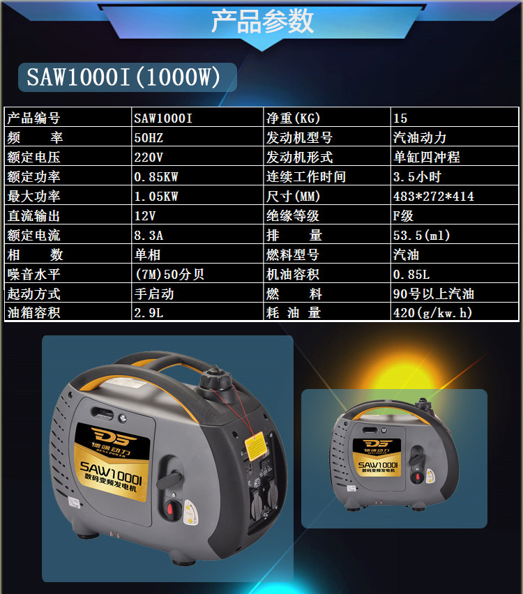 颯威動力不一般的操作設計,簡單易行 耗油量低,經濟實用 經久耐用,可靠性高 省卻繁瑣的維修保養(yǎng) 配有保護裝置,確保運作安 全 采用靜音防震設計 新—先進的變頻技術,100%德國進口 精—波形更趨完美,精密儀器的最佳拍檔 勁—功率輸出更強,燃料消耗更低 小—輕量化設計,機身重量僅有29kg 強勁的輸出功率 優(yōu)異的省油性能 出色的靜音效果 卓越的環(huán)保設計 簡便的操作性能。公司始終致力于;颯威動力品牌系列產品的研發(fā)與生產,科學規(guī)范的管理,嚴格高效的把控,使得產品品質始終穩(wěn)定可靠。我們深諳科技興業(yè)之道,踐行;以人為本的人才戰(zhàn)略,致力于打造高質素 的精英化團隊。現今已擁有一大批極具經驗的企業(yè)管理人員和產品技術人員。堅持科技創(chuàng)新理念,勵精圖治;秉持;專心專業(yè)、追求卓越的企業(yè)精神,追求零缺陷品質和零缺陷新型3kw電啟動數碼變頻發(fā)電機:流線型外形設計耐高溫塑料外罩,更安 全低油位機油報警器數碼控制器過載保護器1000小時連續(xù)工作測試為野營辦公施工用專業(yè)定制支持多臺并聯,效率更高底置凸輪軸噪音更低機油高溫監(jiān)控,使用壽命更長內置高密度隔音海綿,無懼高溫電子打火,一鍵啟動,使用更方便稀土永磁電機,降低設備啟動電流