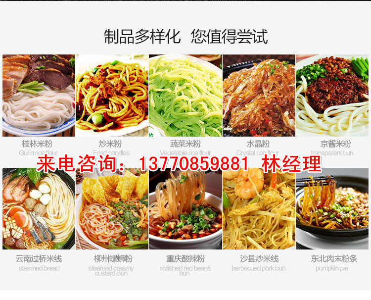 改進型米粉 、米線專用機,裝有自動溫空裝置,整個生產(chǎn)過程設備均在恒溫狀態(tài)下運行,生產(chǎn)時大米不需粉 碎磨面,只要將大米浸泡洗凈投入機器中即可生產(chǎn)出產(chǎn)品,自動化程度高,操作簡單,l人即可生產(chǎn),自動加料、一次自熟成型?缮a(chǎn)米粉 、米線、桂林米粉 、過橋米線、年糕、糍粑等產(chǎn)品。各種形狀都可生產(chǎn)(圓、扁),加工食品外表光滑,厚薄、寬窄、粗細均勻可調(diào),筋軟適度,有彈性,口感柔軟、味道純正。