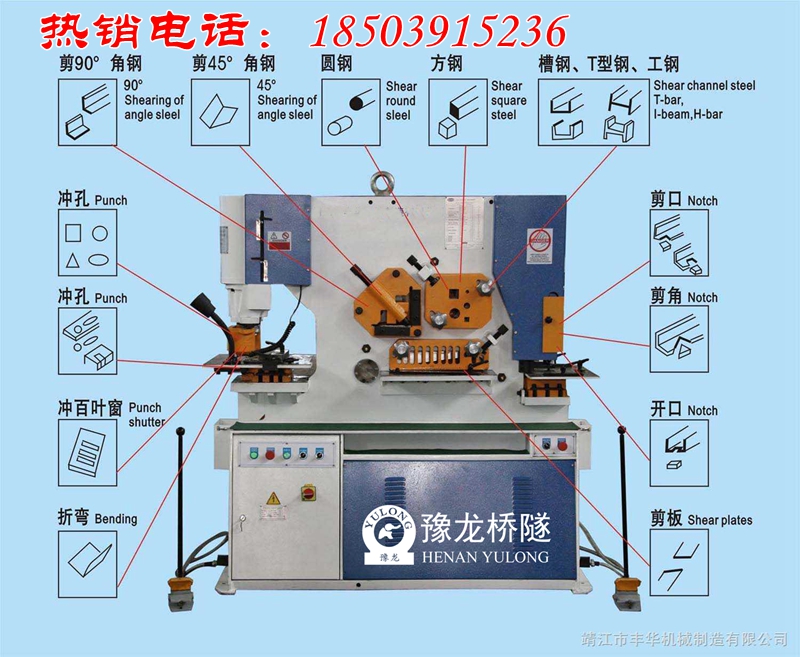 聯(lián)合沖剪機(jī)機(jī)器標(biāo)準(zhǔn)配備沖孔工位,槽鋼及角鋼剪切工位,厚板剪切工位,圓鋼及方鋼剪斷工位,切角工位?蛇x購(gòu)沖大孔,板材折彎,槽鋼型鋼沖孔,百葉窗及管材切角等附件。標(biāo)準(zhǔn)配備五個(gè)工位及雙液壓工作站?赏瑫r(shí)獨(dú)立工作。機(jī)器無須進(jìn)行任何水平調(diào)試,擺放就位后即可使用 。