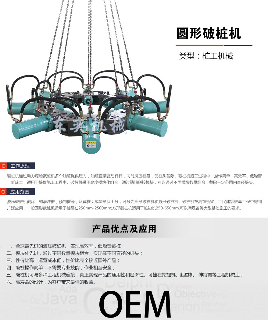 液壓破樁機(jī)又叫截樁機(jī),現(xiàn)代建筑的建設(shè)需要基礎(chǔ)打樁,為了更好的讓基礎(chǔ)樁與地面混凝土結(jié)構(gòu)部分銜接,基礎(chǔ)樁一般會(huì)伸出地面1到2米,使鋼筋完整地保留在地面,截樁機(jī)是破除基礎(chǔ)樁地面樁頭混凝土的專用設(shè)備。液壓式混凝土破樁機(jī)替代了和傳統(tǒng)的破碎方法。它在破碎混凝土?xí)r不會(huì)產(chǎn)生壓力波,也沒有振動(dòng)、噪音和粉 塵,該機(jī)在混凝土拆除領(lǐng)域具有安 全、高效、節(jié)能等眾多優(yōu)點(diǎn)。傳統(tǒng)的樁頭破除方法大多采用破碎錘打擊、人工打釬或風(fēng)鎬拆除等方法;然而上述傳統(tǒng)方法存在著多種弊端:破碎錘敲擊雖然工作效率高,但因?yàn)榇驌袅Υ,?huì)損壞樁基內(nèi)部。破樁機(jī)簡(jiǎn)單的操作系統(tǒng),較少的人員配備,減低施工成本;整體樁頭破碎施工,解決粉 碎性施工能耗高的問題;可伸縮吊鏈?zhǔn)皆O(shè)計(jì),滿足多地形施工作業(yè)要求;全液壓式驅(qū)動(dòng)實(shí)現(xiàn)樁頭施工的低噪音作業(yè);快速組裝設(shè)計(jì),實(shí)現(xiàn)便捷的運(yùn)輸和施工,提高施工效率;新材料新工藝的應(yīng)用,提高設(shè)備可靠性,降低維護(hù)成本;簡(jiǎn)易的模塊拆換設(shè)計(jì)和通用技術(shù),實(shí)現(xiàn)快速維護(hù),有效提高整機(jī)壽命;高壽命設(shè)計(jì),為客戶帶來收益。