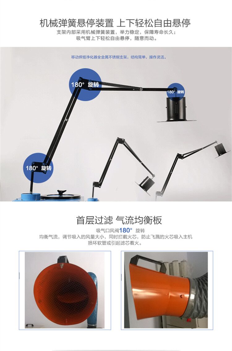 5、利用可360度隨意活動的萬向吸臂,可從煙氣發(fā)生處吸除煙氣,大大提高了煙塵的收集率,保證了作業(yè)人員的健康。