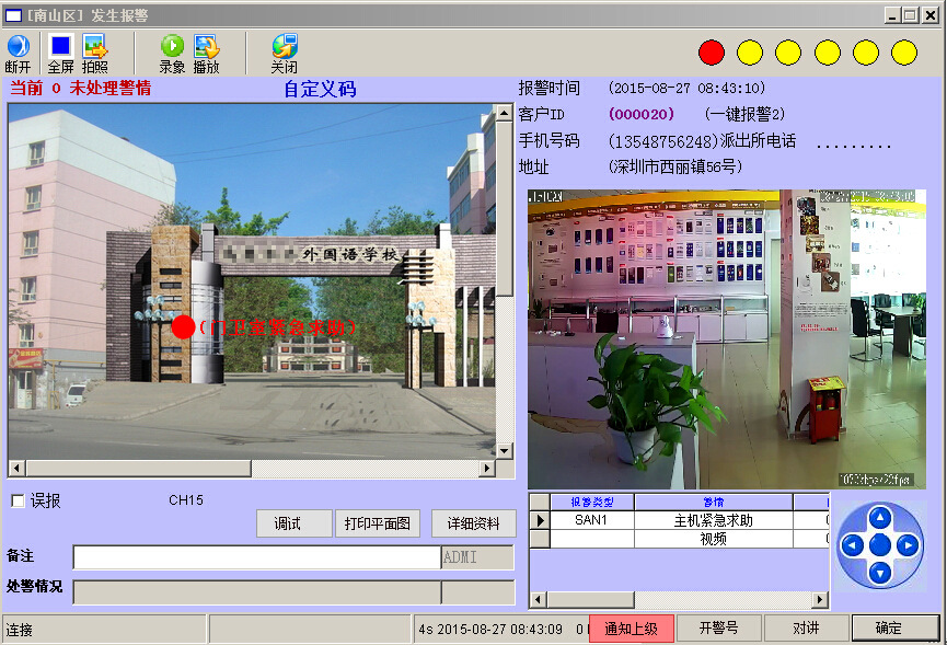 1.按下一鍵緊急按鈕,轄區(qū)110應(yīng)急中心會(huì)有報(bào)警提示音并彈出視頻,同時(shí)會(huì)在地圖上指示出發(fā)生報(bào)警的具體位置(如麻 磡實(shí)驗(yàn)小學(xué)保安 室);