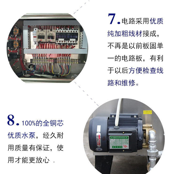 7、鍋爐安 全設(shè)有多級(jí)聯(lián)鎖保護(hù):壓力開關(guān)保護(hù)(高于設(shè)定壓力自動(dòng)停機(jī)并報(bào)警)、低水位保護(hù)(鍋爐本體內(nèi)水位低于警戒水位,自動(dòng)切斷電源并報(bào)警)、安 全閥保護(hù)(鍋爐壓力超過工作壓力,自動(dòng)泄氣降壓),確保鍋爐在各種工況下萬無一失,安 全到家。